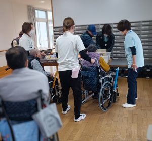 今回は、外が寒いため、エルベの玄関内に商品を並べてくれました。色々なお菓子やパンなどがあり、入居者様も何を買おうかと迷う方もいらっしゃいました。たくさんの方が買いに来られました。