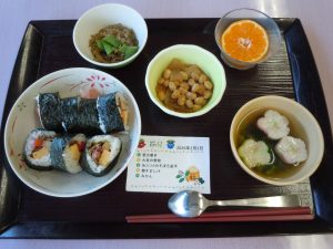 毎年ですが、節分の日には、巻きずしがご提供されます。色々な具が入った巻きずしに、久しぶりで美味しかったと入居者様も喜んでいらっしゃいました(^^♪